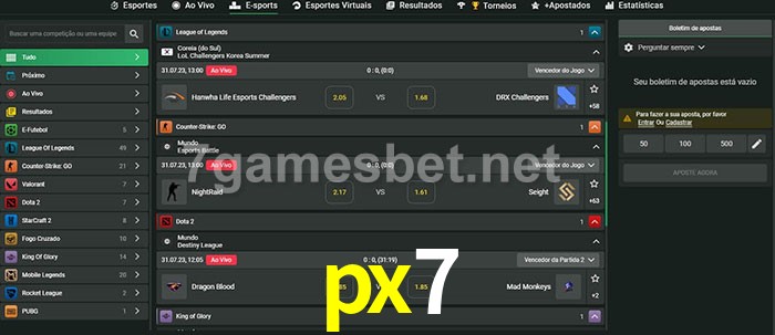 O px7 oferece uma grande seleção de opções de apostas em e-sports com probabilidades competitivas